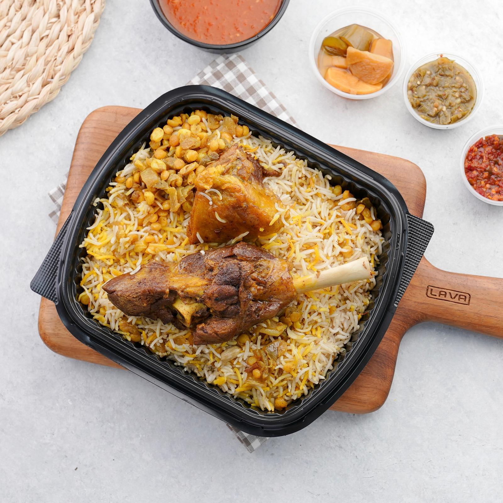 HomeOriginal Kuwaiti meat machboosOriginal Kuwaiti meat machboosDescriptionA Kuwaiti dish of basmati rice with meat, prepared with our special spices and served with daqoos, agar and mabaij.Your Choice Of Broth * Okra BrothDaqusPotato BrothYour choice of filling * Adding stuffingwithout stuffingYour choice of salad Yoghurt CucumberTabbouleh LozaArugula SaladFattoush SaladGreen SaladAdditionsCaramelized OnionsPotato KibbehCheese SamosaGreen MaaboujRed MaaboujLentil SoupPotatoMeat KibbehYour Choice Of Drink: Loza MilkPEPSIPepsi diet7 up 7 up dietMirandaMineral WaterShani